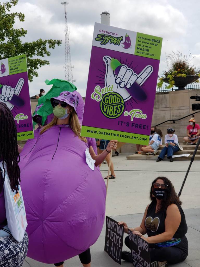 About a dozen women dressed as pregnant eggplants (called Operation Eggplant) pointed out the absence of male responsibility in every heartbeat bill is draconian, misogynistic, and woefully unfair. They want legislation to force men to take responsibility for the fetus and the same type of vigilante bounty hunters to find the men whether they are prepared to be a father or not.