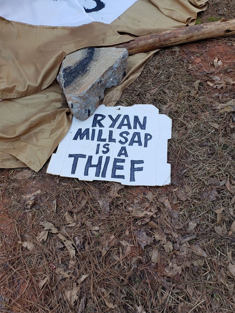 After Christman, Ryan Millsap, the Hollywood grifter who talked DeKalb County into swapping beautiful forested land for a pile of red dirt, came back to destroy Intrenchment Creek Park. With help from the police, Millsap used heavy equipment to destroy the parking area, the gazebo, and the concert bike/walking path and cut down more trees in violation of a lawsuit and a stop work order.