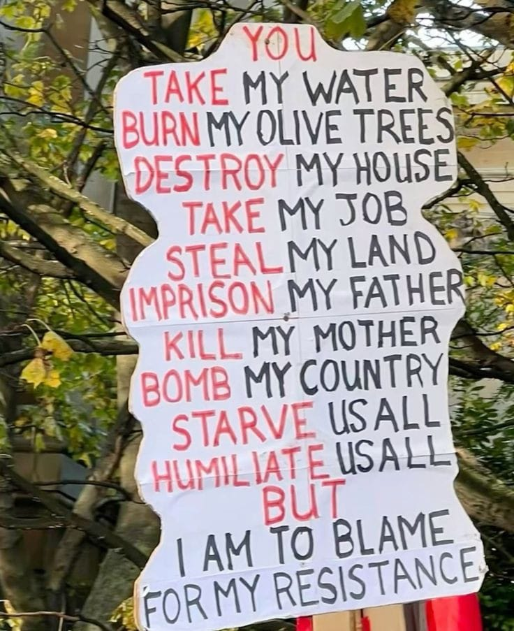 Just days after October 7, the Israeli Defense Minister, Yoav Gallant, said that they were cutting off all food, fuel, water, and electricity to Gaza because they were fighting “human animals.” Benjamin Netanyahu, the Prime Minister, said the Palestinians have the option to leave or die.