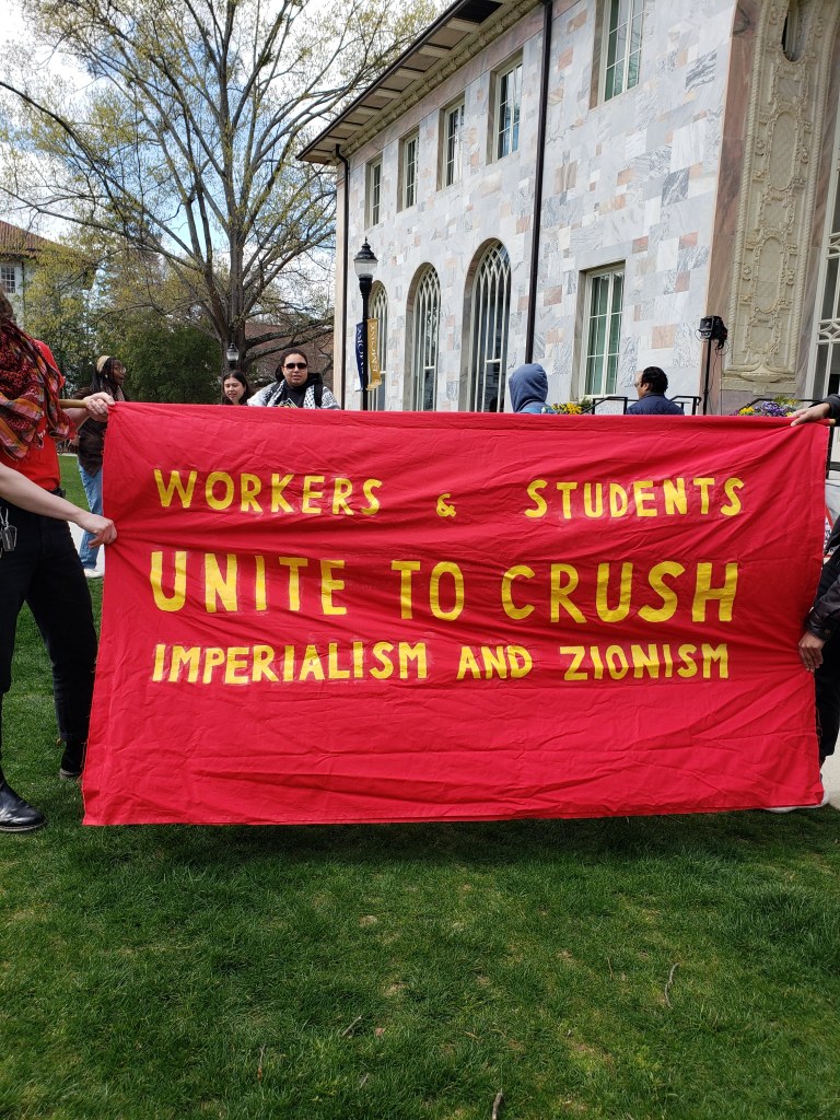 “We have all gathered here today to stand in solidarity with Palestine, supporting those who are suffering in Gaza and the West Bank. I want to address the role of our union in defending the rights of our fellow student workers targeted by the Trump administration and their accomplices in higher education for doing precisely what we have come together for today. Our position is unique as the only group on campus that can collectively bargain with the university.